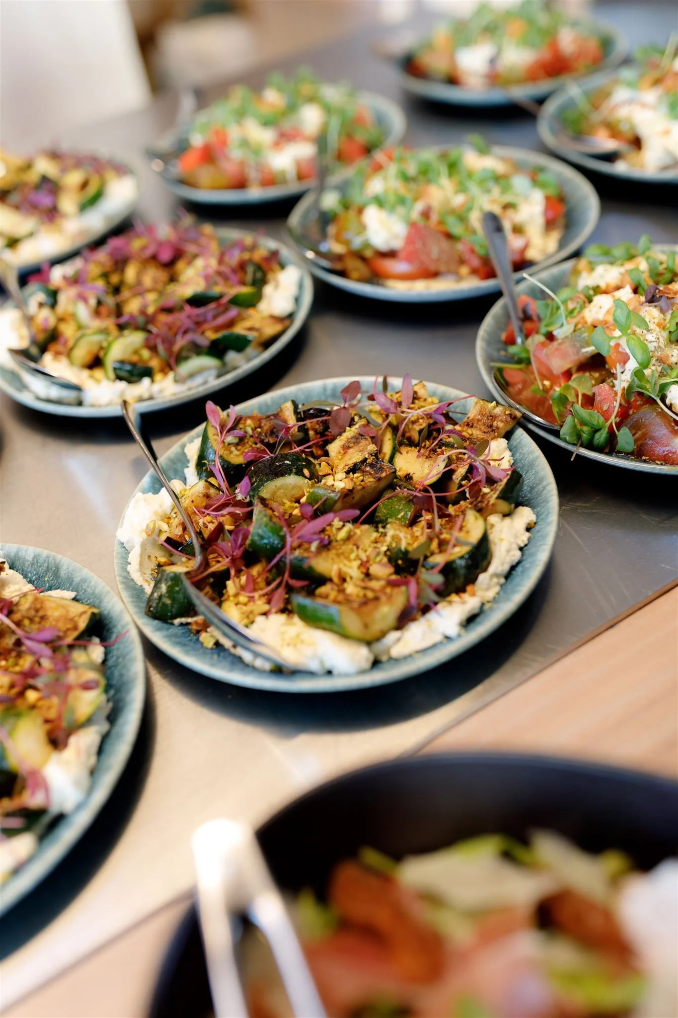 A deliciously fresh salad with broccolini, shallots, green peas, steamed potatoes, parsley, mint, coriander, pepitas & green goddess dressing